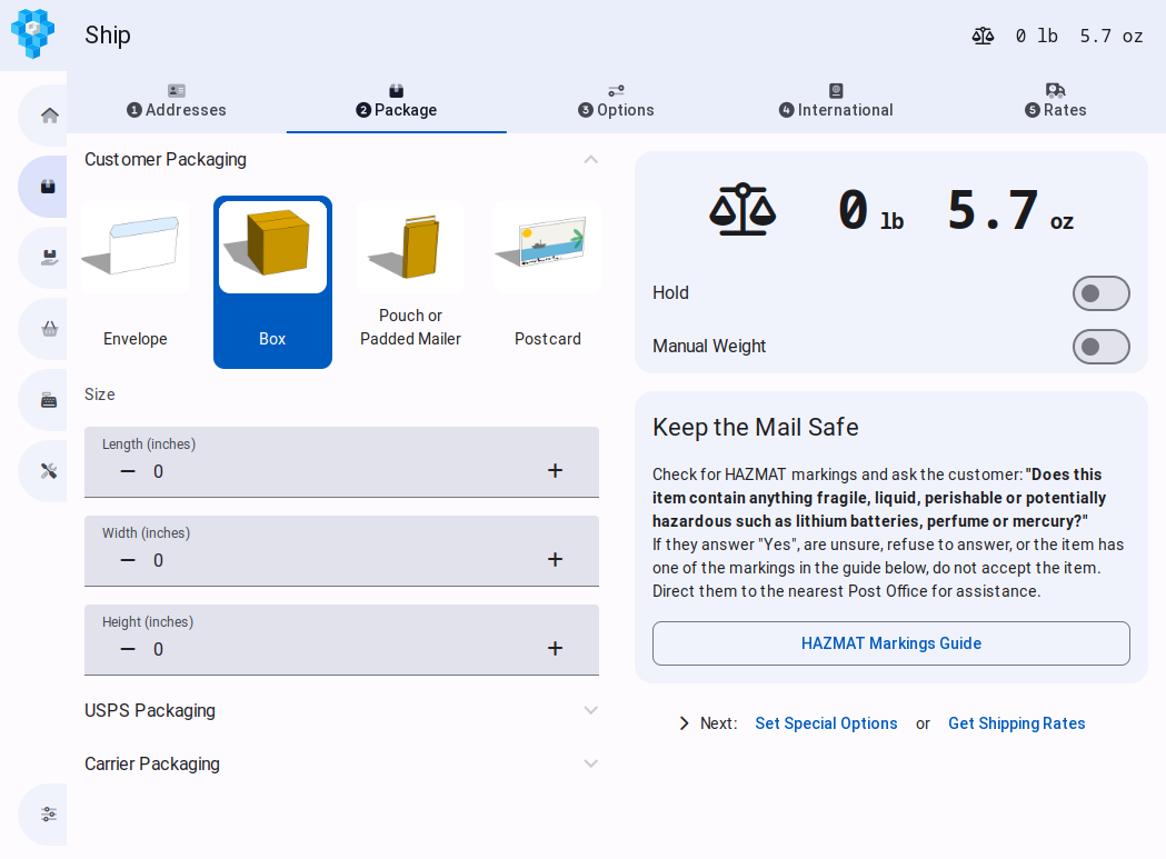 Just scan the barcode printed on any USPS Priority or Express box or envelope and the correct dimensions and shape will instantly be entered for you. To eliminate confusion and costly mistakes, PostalPoint will only show shipping services compatible with the packaging selected.