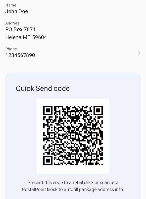 Customers can save addresses in the PostalPoint mobile app, then simply present their phone screen to scan when sending a package. The to and from addresses will be filled instantly for you.